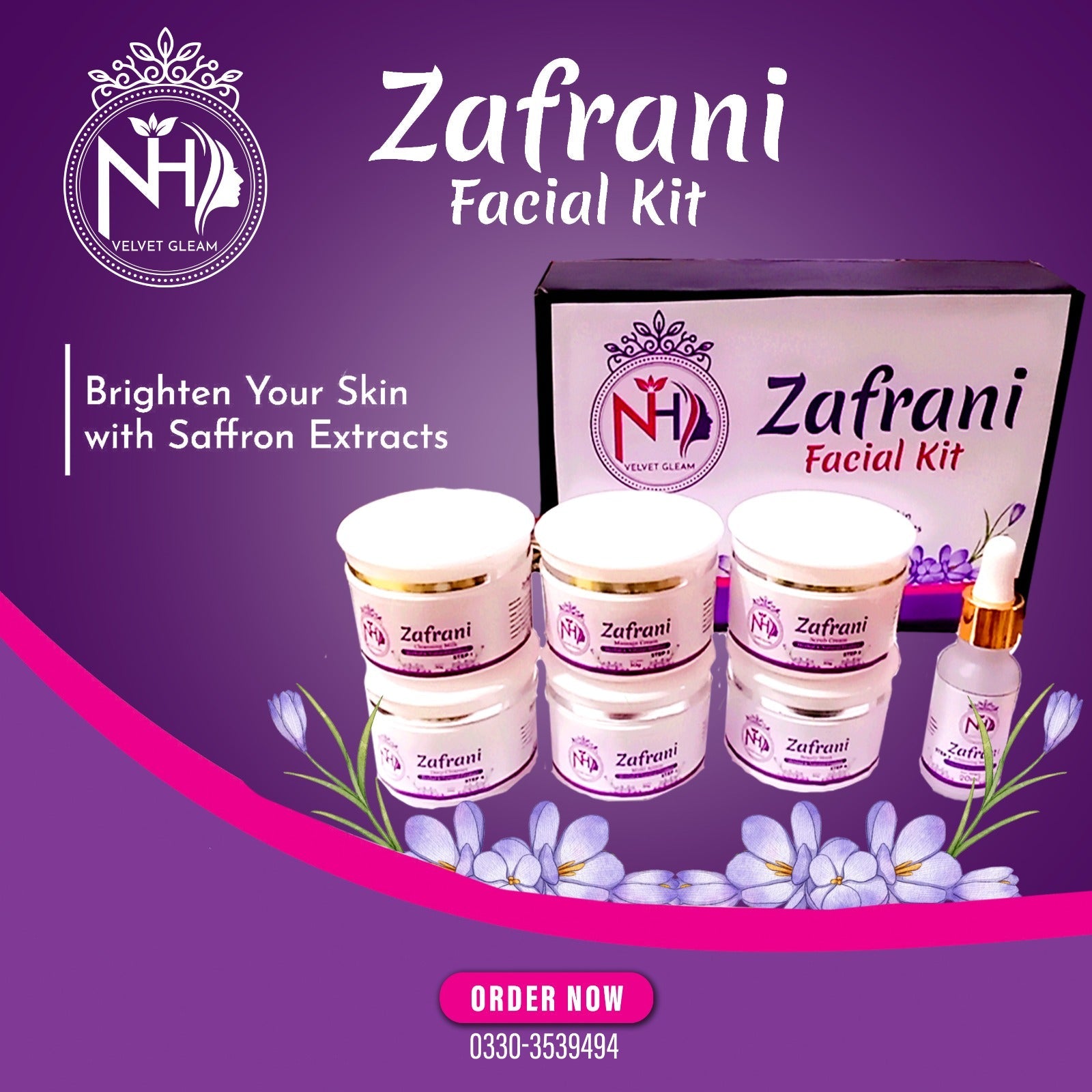 Zafrani Facial Kit ek luxurious herbal treatment hai jo aapko deti hai salon jaisa glow ghar baithe. Isme mojood asli zaafran extracts, vitamin E, aur natural oils aapki skin ko deep cleanse, nourish aur brighten karte hain. Har step skin ko ek naye level ka softness aur radiance deta hai.